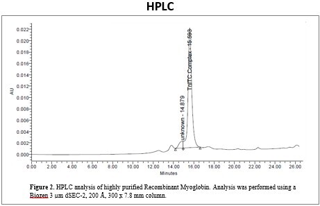 The HPLC elution profile for recombinant Tn-ITC complex, is shown in Figure 2. The chromatogram reveals a main peak eluting at 15.593 minutes with a small shoulder at 14.879 minutes. Purity of the Tn-ITC complex is >95%.